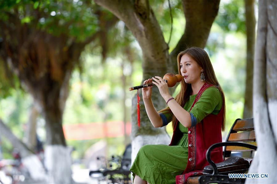 Takyrbasheva Asel, a student from Kyrgyzstan, plays the Hulusi, a free-reed wind instrument from China, at the campus of Hainan University in Haikou, south China's Hainan Province, June 13, 2019. Kyrgyz girl Takyrbasheva Asel majors in Tourism Management in Hainan University. She has dedicated herself in experiencing the Chinese culture, including the learning of traditional Chinese musical instruments, Taiji and martial arts, and tea art since she came to China three years ago. She hoped she could stay in China after graducation and invite people from her hometown to come and experience the Chinese culture. Statistics showed that over 4,600 Kyrgyz students studied in China in 2018. (Xinhua/Guo Cheng)