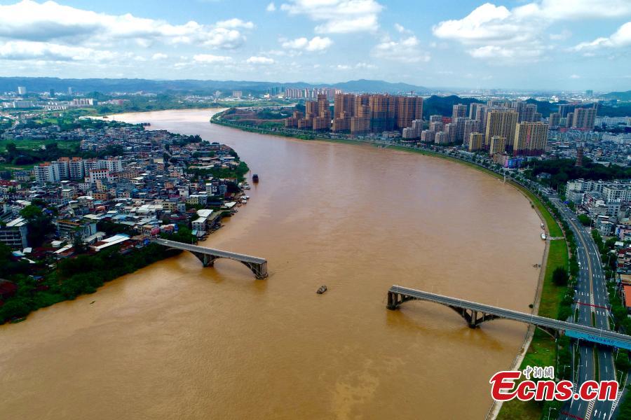 Photo taken on June 14, 2019 shows the collapsed Zijin Bridge in Yuancheng District, Heyuan City, Guangdong Province. Two vehicles plunged to the water when the bridge fell at around 2 am on Friday, with one person rescued. Search and rescue efforts are still underway and the cause of the collapse is under investigation. (Photo provided by the Publicity Department of the CPC Heyuan Committee)