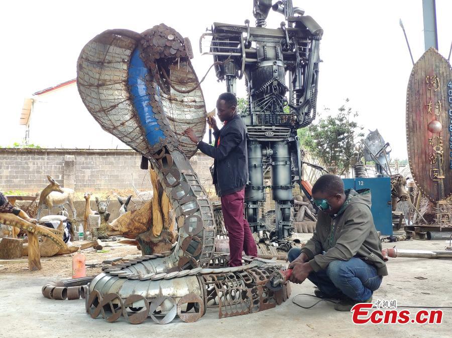 About ten young artists from Uganda have created impressive designs featuring African culture and wildlife including elephants and giraffes in a park in Changsha City, Central China’s Hunan Province as part of cooperation project between Hunan and Uganda. (Photo: China News Service/Wang Haohao)