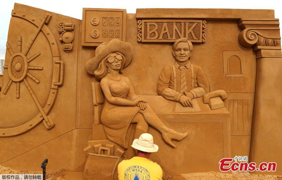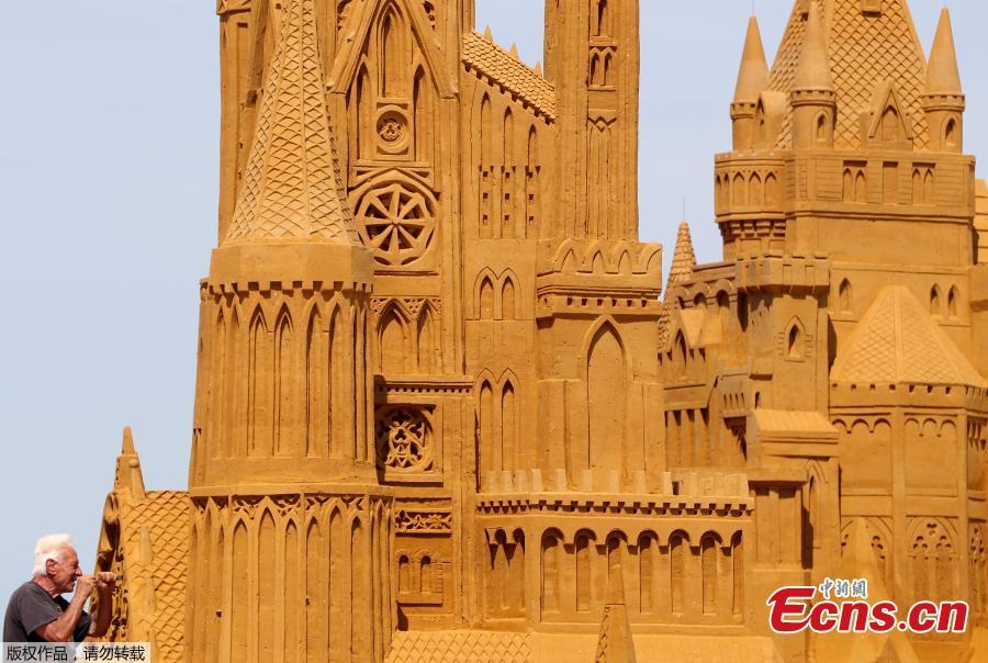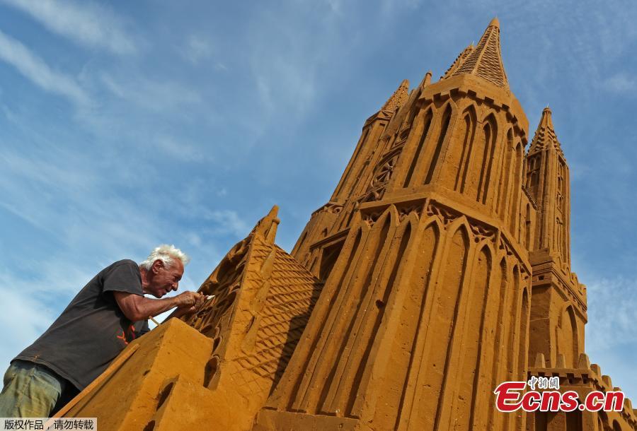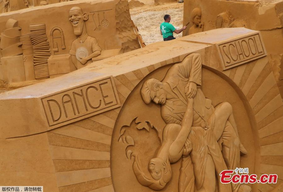 A sand carver works on a sculpture during the Sand Sculpture Festival "Dreams" in Ostend, Belgium June 18, 2019.(Photo/Agencies)