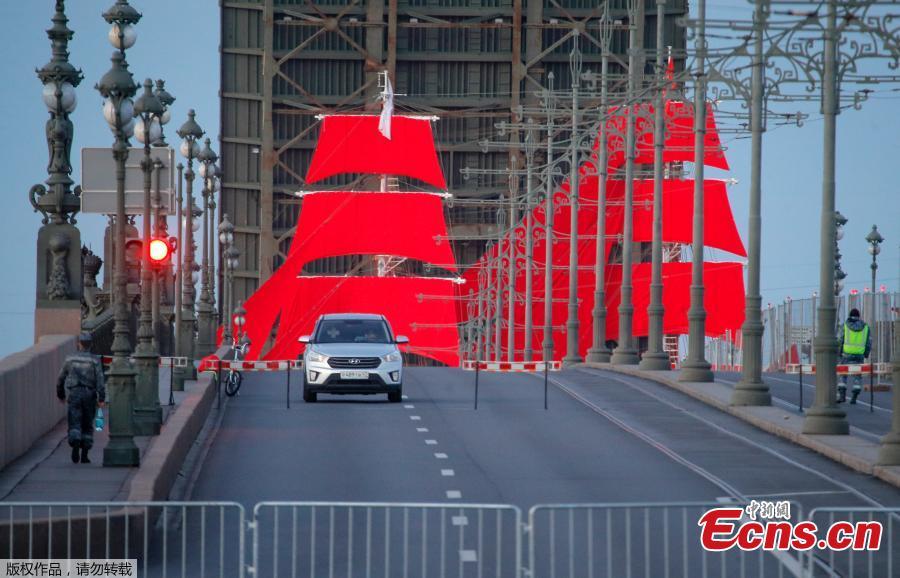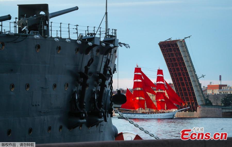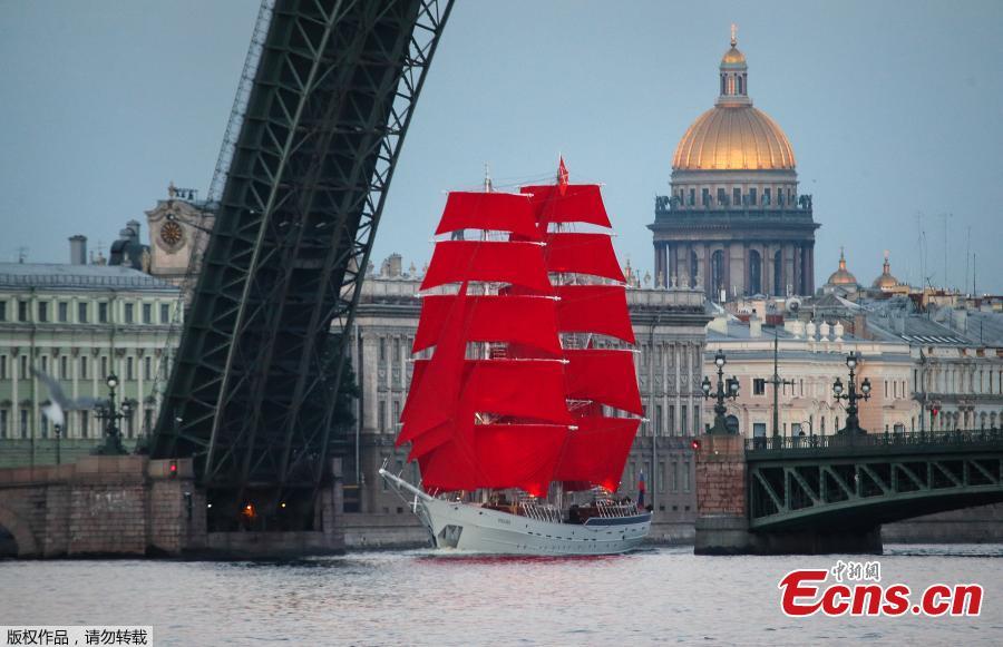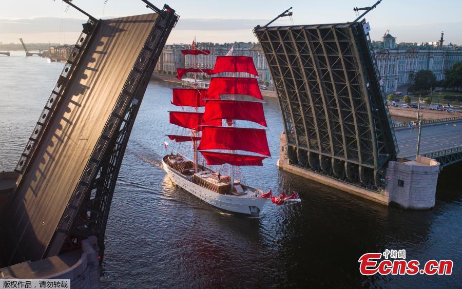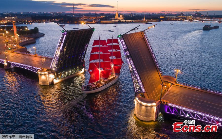 A brig with scarlet sails travels through the Dvortsovy (Palace) drawbridge rising above the Neva River during a rehearsal for the the Scarlet Sails festivities marking school graduation which will take place on June 24 in St. Petersburg, Russia, early Monday, June 17, 2019. (Photo/Agencies)