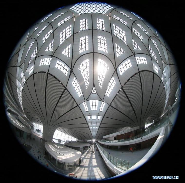 Photo taken with a fisheye lens on June 18, 2019 shows the terminal building of Beijing Daxing International Airport in Beijing, capital of China. The construction of the Beijing Daxing International Airport is expected to be completed by the end of this month. The new airport is scheduled to be put into operation before Sept. 30. (Xinhua/Zhang Yudong)
