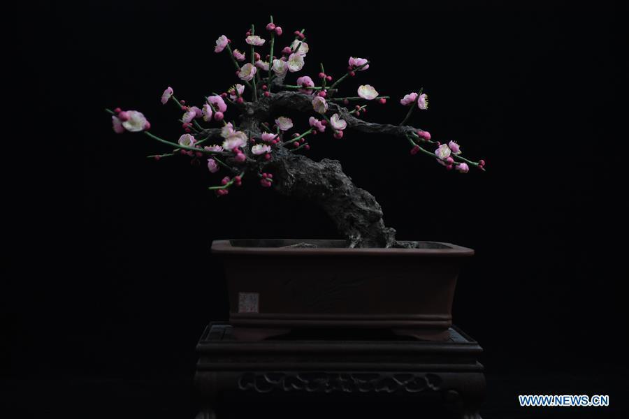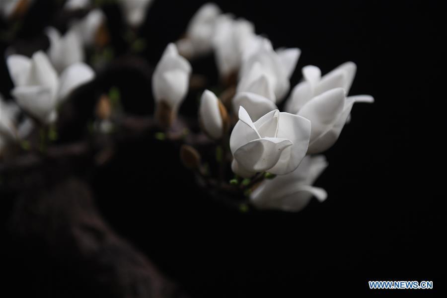 Photo taken on June 18, 2019 shows a potted landscape made from chocolate vine in Yangzhou, east China's Jiangsu Province. Chocolate vine, or akebia quinata, makes a great ingredient of various crafts including artificial flowers. The flower-making is complex, as it contains a series of procedures including bleaching, pasting, shaping and dyeing. Yet, the artificial flowers made from such shrub are vivid and have high value. In 2007, the flower-making techniques were listed as provincial intangible cultural heritage in Jiangsu. Dai Chunfu, 79, has been an inheritor of such art in Yangzhou since his childhood. Dai is skillful with years of experience and has accepted more than 10 apprentices. He welcomes the younger generation to learn this delicate art so as to pass the torch. (Xinhua/Ji Chunpeng)