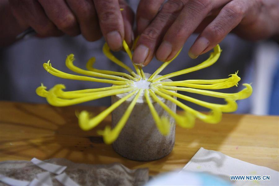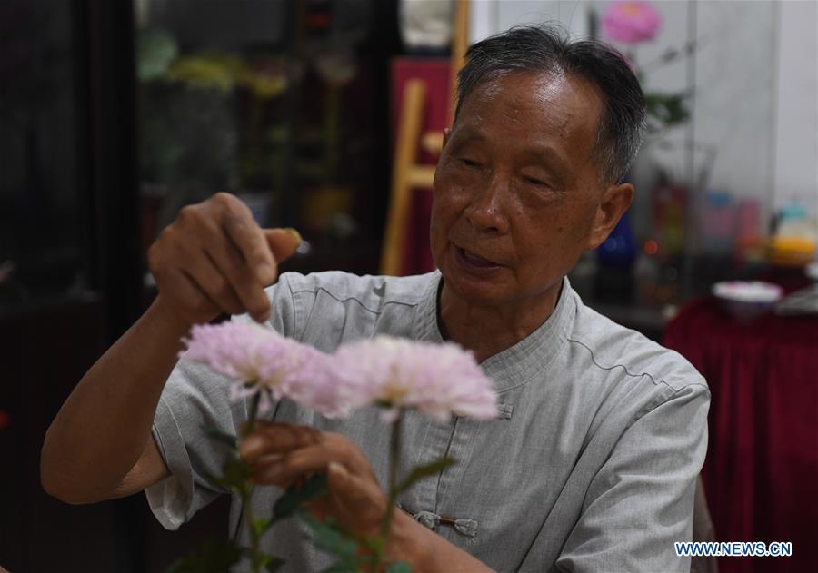 Dai Chunfu pastes petals made from chocolate vine in Yangzhou, east China's Jiangsu Province, June 18, 2019. Chocolate vine, or akebia quinata, makes a great ingredient of various crafts including artificial flowers. The flower-making is complex, as it contains a series of procedures including bleaching, pasting, shaping and dyeing. Yet, the artificial flowers made from such shrub are vivid and have high value. In 2007, the flower-making techniques were listed as provincial intangible cultural heritage in Jiangsu. Dai Chunfu, 79, has been an inheritor of such art in Yangzhou since his childhood. Dai is skillful with years of experience and has accepted more than 10 apprentices. He welcomes the younger generation to learn this delicate art so as to pass the torch. (Xinhua/Ji Chunpeng)