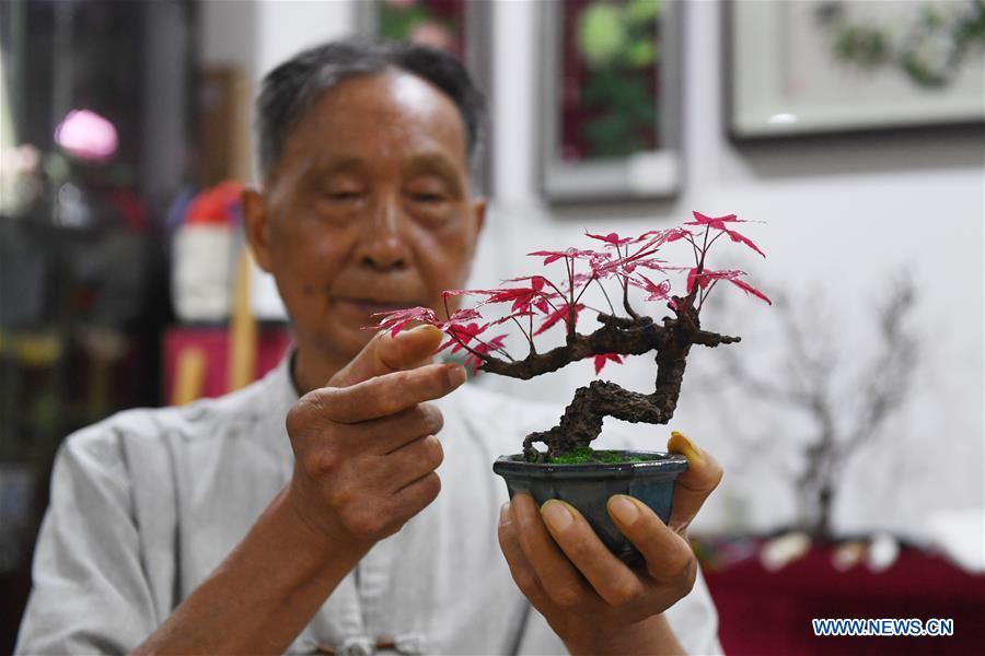 Dai Chunfu shows a potted landscape made by himself in Yangzhou, east China's Jiangsu Province, June 18, 2019. Chocolate vine, or akebia quinata, makes a great ingredient of various crafts including artificial flowers. The flower-making is complex, as it contains a series of procedures including bleaching, pasting, shaping and dyeing. Yet, the artificial flowers made from such shrub are vivid and have high value. In 2007, the flower-making techniques were listed as provincial intangible cultural heritage in Jiangsu. Dai Chunfu, 79, has been an inheritor of such art in Yangzhou since his childhood. Dai is skillful with years of experience and has accepted more than 10 apprentices. He welcomes the younger generation to learn this delicate art so as to pass the torch. (Xinhua/Ji Chunpeng)