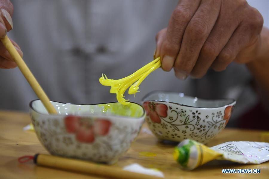 Dai Chunfu dyes artificial petals in Yangzhou, east China's Jiangsu Province, June 18, 2019. Chocolate vine, or akebia quinata, makes a great ingredient of various crafts including artificial flowers. The flower-making is complex, as it contains a series of procedures including bleaching, pasting, shaping and dyeing. Yet, the artificial flowers made from such shrub are vivid and have high value. In 2007, the flower-making techniques were listed as provincial intangible cultural heritage in Jiangsu. Dai Chunfu, 79, has been an inheritor of such art in Yangzhou since his childhood. Dai is skillful with years of experience and has accepted more than 10 apprentices. He welcomes the younger generation to learn this delicate art so as to pass the torch. (Xinhua/Ji Chunpeng)