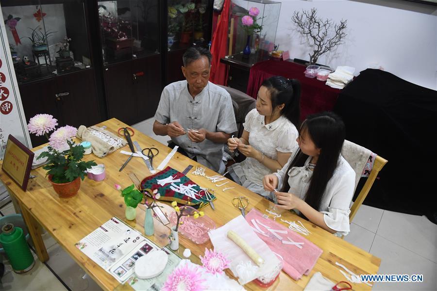 Dai Chunfu (1st L) makes artificial flowers with his apprentices in Yangzhou, east China's Jiangsu Province. Chocolate vine, or akebia quinata, makes a great ingredient of various crafts including artificial flowers. The flower-making is complex, as it contains a series of procedures including bleaching, pasting, shaping and dyeing. Yet, the artificial flowers made from such shrub are vivid and have high value. In 2007, the flower-making techniques were listed as provincial intangible cultural heritage in Jiangsu. Dai Chunfu, 79, has been an inheritor of such art in Yangzhou since his childhood. Dai is skillful with years of experience and has accepted more than 10 apprentices. He welcomes the younger generation to learn this delicate art so as to pass the torch. (Xinhua/Ji Chunpeng)