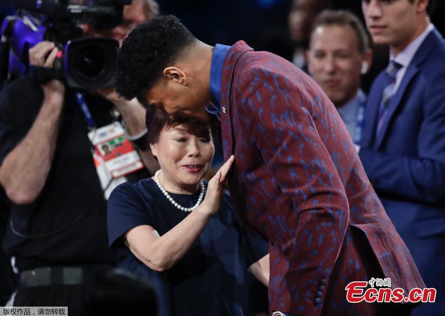 Japan’s Rui Hachimura, of Gonzaga, hugs loved ones after the Washington Wizards selected him as the ninth pick overall pick in the NBA basketball draft Thursday, June 20, 2019, in New York. (Photo/Agencies)