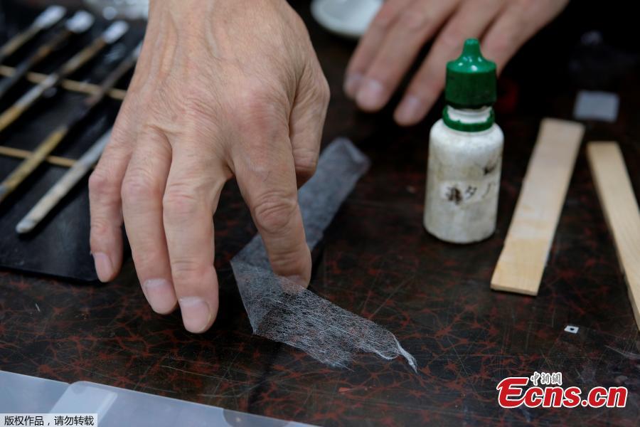 This picture taken on June 4, 2019 shows Takao Makino (L), head of Kibi conservation studio, repairing cultural property in Saitama, outside Tokyo. Once indispensible for the daily life of Japanese, washi - literally "Japanese paper"- was used not only for writing and painting but also for sliding doors, room dividers, lampshades and umbrellas.(Photo/Agencies)