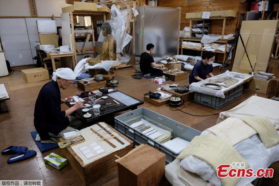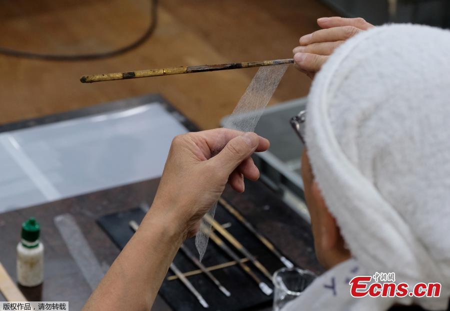 This picture taken on June 4, 2019 shows Takao Makino, head of the Kibi conservation studio, carefully applying "washi" onto a brush onto golden sticks representing the halo of a Buddhist statue estimated to be around 800 years old, in Saitama, outside Tokyo. Once indispensible for the daily life of Japanese, washi-literally "Japanese paper" -was used not only for writing and painting but also for sliding doors, room dividers, lampshades and umbrellas. (Photo/Agencies)