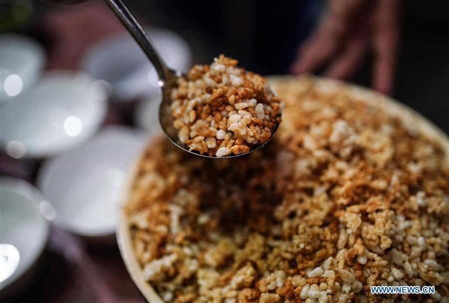 Photo taken on June 20, 2019 shows the fried rice for oleic tea in Xinzhai Village of Weijiang Township in south China's Guangxi Zhuang Autonomous Region. People of the Miao ethnic group in the village have the tradition of drinking oleic tea in their daily life, also for welcoming guests. The technique of making oleic tea was enlisted as one of the intangible cultural heritages of Guangxi in 2018. (Xinhua/Huang Yongdan)