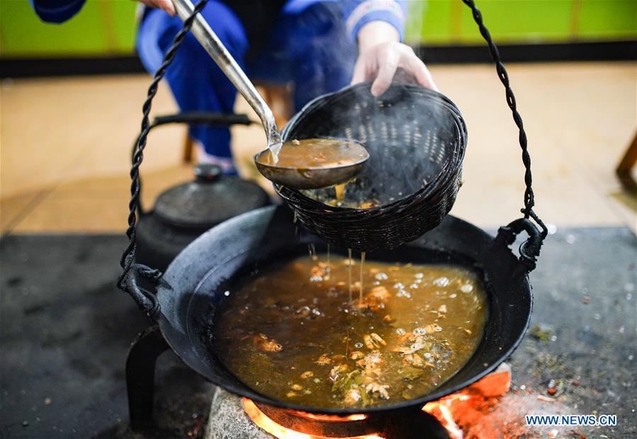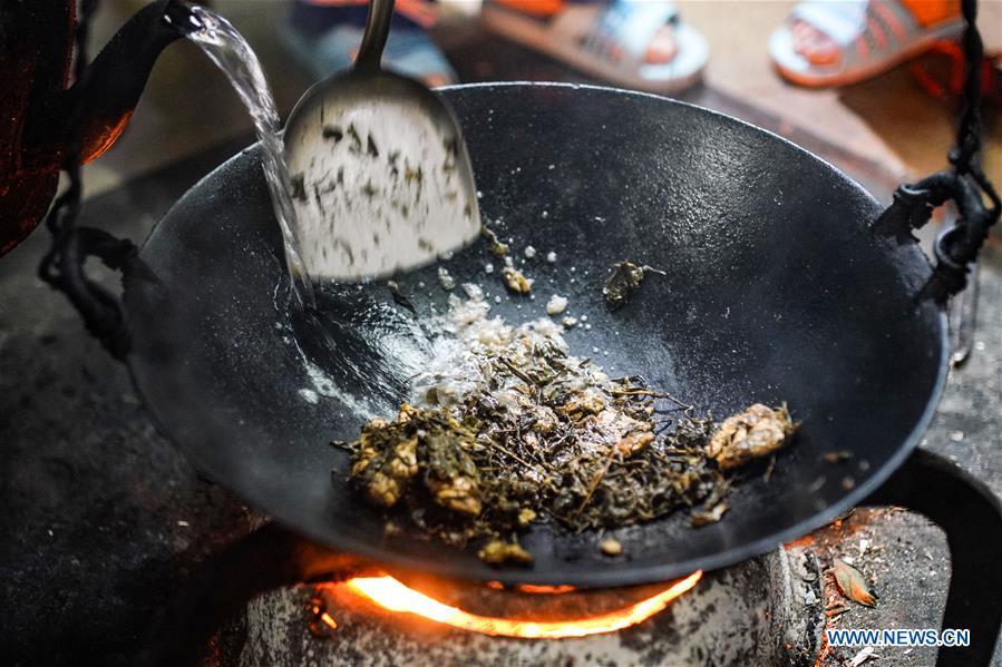 A woman cooks rice for oleic tea in Xinzhai Village of Weijiang Township in south China's Guangxi Zhuang Autonomous Region, June 20, 2019. People of the Miao ethnic group in the village have the tradition of drinking oleic tea in their daily life, also for welcoming guests. The technique of making oleic tea was enlisted as one of the intangible cultural heritages of Guangxi in 2018. (Xinhua/Huang Yongdan)