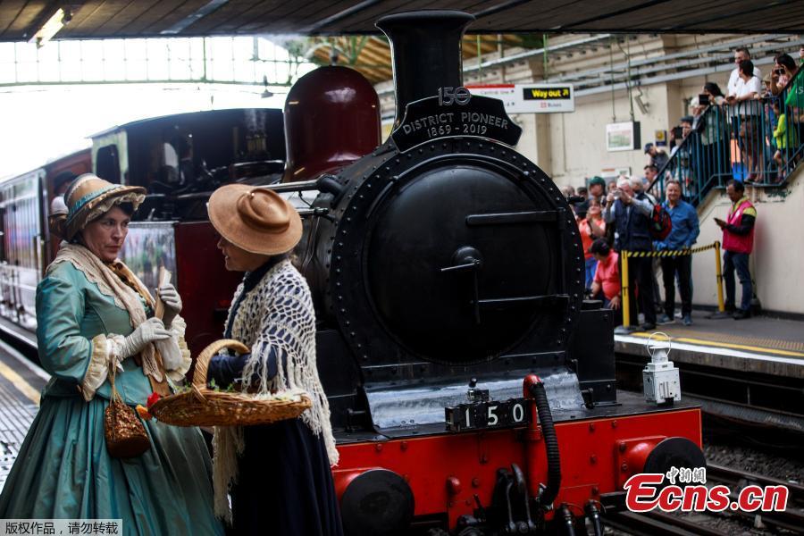 Re-enactors talk as the restored steam locomotive Metropolitan No.1 pulls into Ealing Broadway underground station in London, Britain June 22, 2019.(Photo/Agencies)