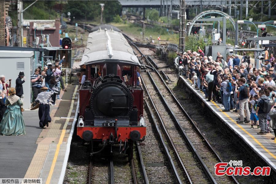 Re-enactors gesture as the restored steam locomotive Metropolitan No.1 leaves Ealing Broadway underground station in London, Britain, June 22, 2019.(Photo/Agencies)