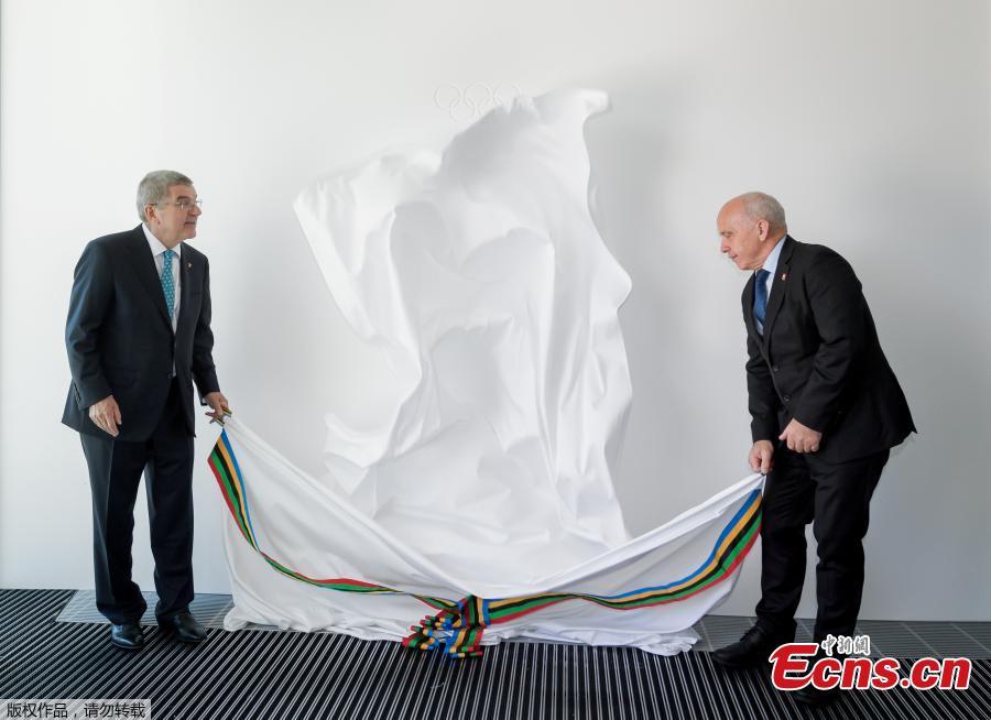 International Olympic Committee (IOC) President Thomas Bach and Swiss President Ueli Maurer unveil a plate during the inauguration ceremony of the Olympic House, the new IOC headquarters, in Lausanne, Switzlerland June 23, 2019 ahead of the decision on 2026 Winter Games host. (Photo/Agencies)