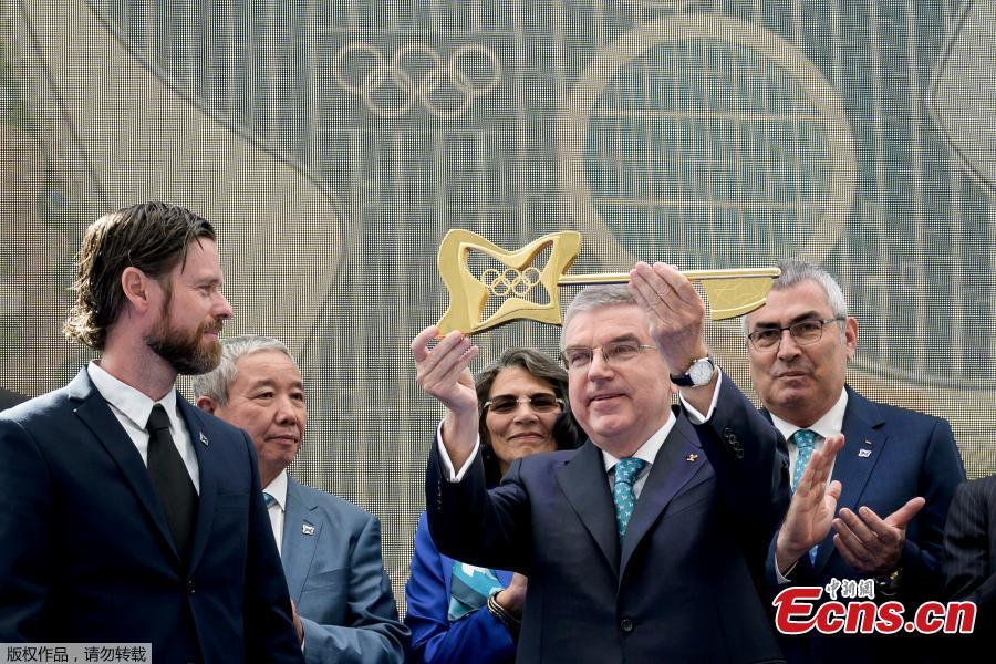 International Olympic Committee (IOC) President Thomas Bach (C) raises the key next to senior architect Jan Ammundsen (L) during the inauguration of the new IOC headquarters in Lausanne, Switzerland June 23, 2019 ahead of the decision on 2026 Winter Games host. (Photo/Agencies)