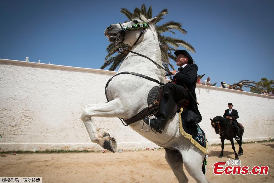 A horse rears during the "Jocs des Pla", equestrian games celebrated at the crowded port during the traditional Sant Joan (Saint John) festival in the town of Ciutadella, on the Balearic Island of Minorca, on Saint John's day on June 24, 2019. (Photo/Agencies)