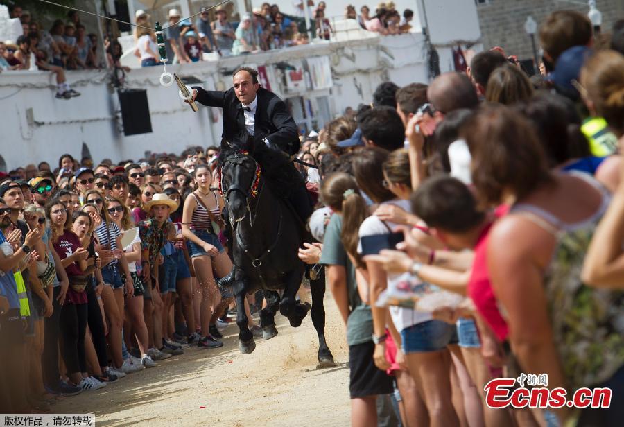 A rider gallops with a spear during the "Jocs des Pla", equestrian games celebrated at the crowded port during the traditional Sant Joan (Saint John) festival in the town of Ciutadella, on the Balearic Island of Minorca, on Saint John's day on June 24, 2019.(Photo/Agencies)