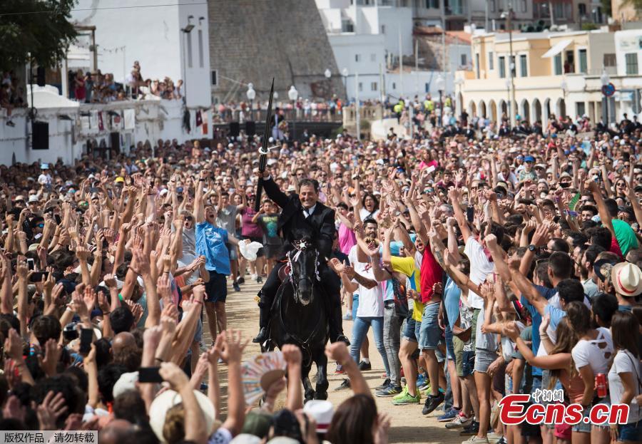 A rider gallops with a spear during the "Jocs des Pla", equestrian games celebrated at the crowded port during the traditional Sant Joan (Saint John) festival in the town of Ciutadella, on the Balearic Island of Minorca, on Saint John's day on June 24, 2019.(Photo/Sipaphoto)