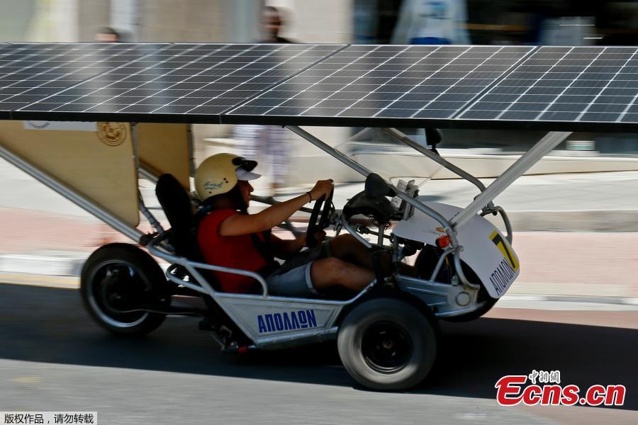 A Cypriot competitor steers his solar car during the Cyprus Institute's solar car challenge in Nicosia on June 23, 2019. The solar car challenge was organized by Cyprus Institute to promote the use of renewable energy. Teams had to design and build a solar car for less than 20,000 euros. (Photo/Agencies)