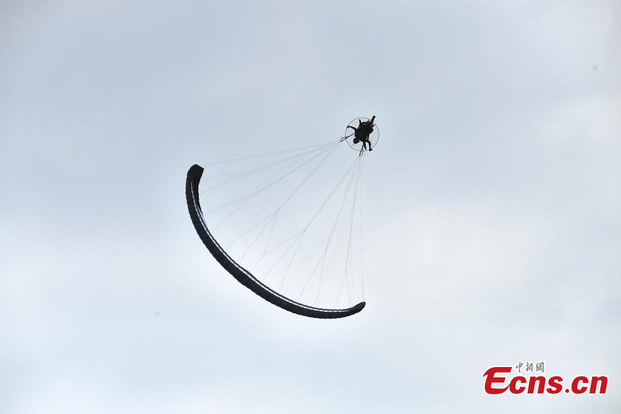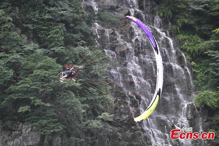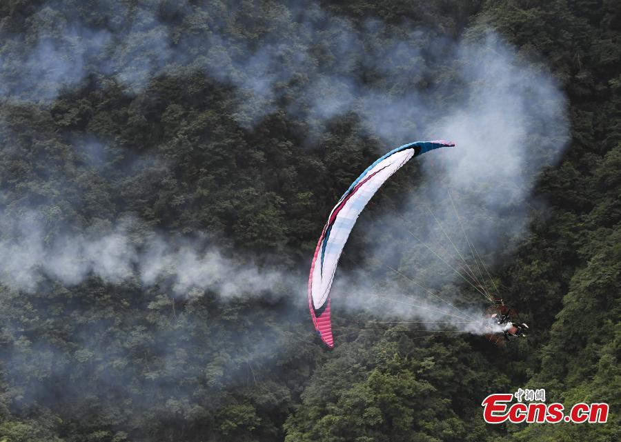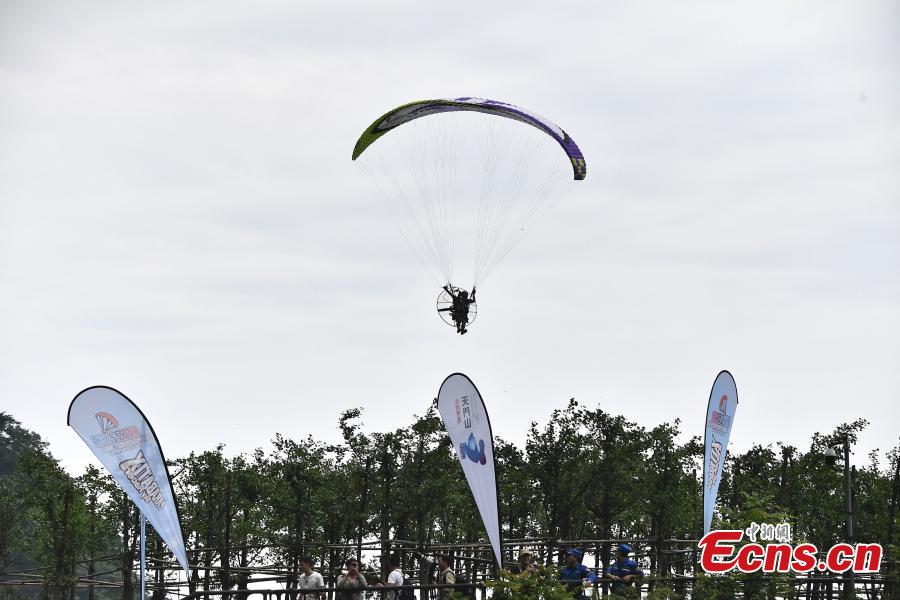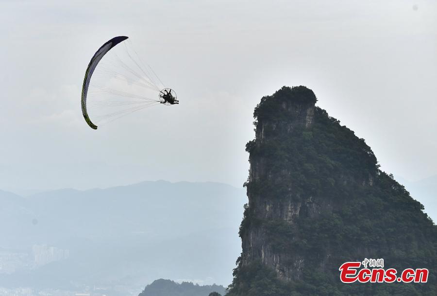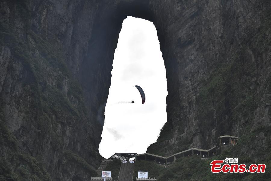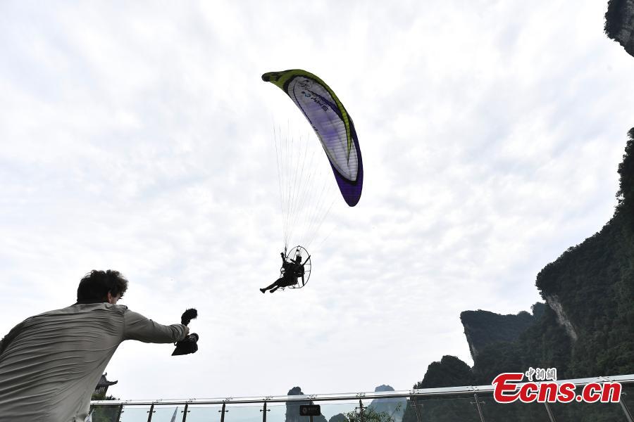 A contestant in a competition for motorized paragliders at Tianmen Mountain in Zhangjiajie, Central China's Hunan Province, trains on June 26, two days before the competition begins. (Photo/China News Service)