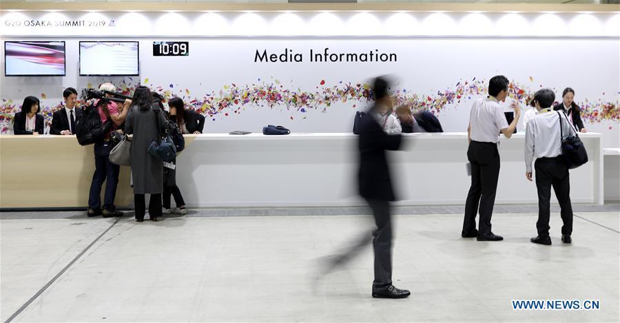 Journalists work at the media center of the 14th Group of 20 (G20) summit in Osaka, Japan, June 27, 2019. The 14th G20 summit will be held in Osaka from June 28 to 29. The media center of the summit was formally put into use on Thursday. (Xinhua/Li Gang)