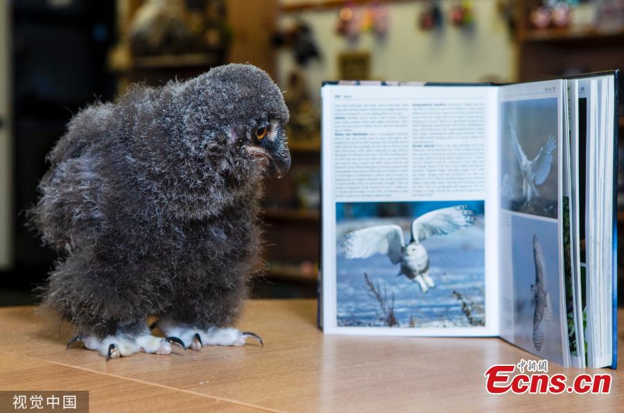 The picture shows a four-week-old Snowy owl having a hoot while it studiously reads a book - all about owls. The fluffy dark grey bird with white claws and big orange and blue eyes currently lives at the Scottish Owl Centre in West Lothian. Born on May 27, the cute bird helps out senior keeper Tristan Williams, greeting people as they enter and even keeping guard of the cash register.(Photo/VCG)