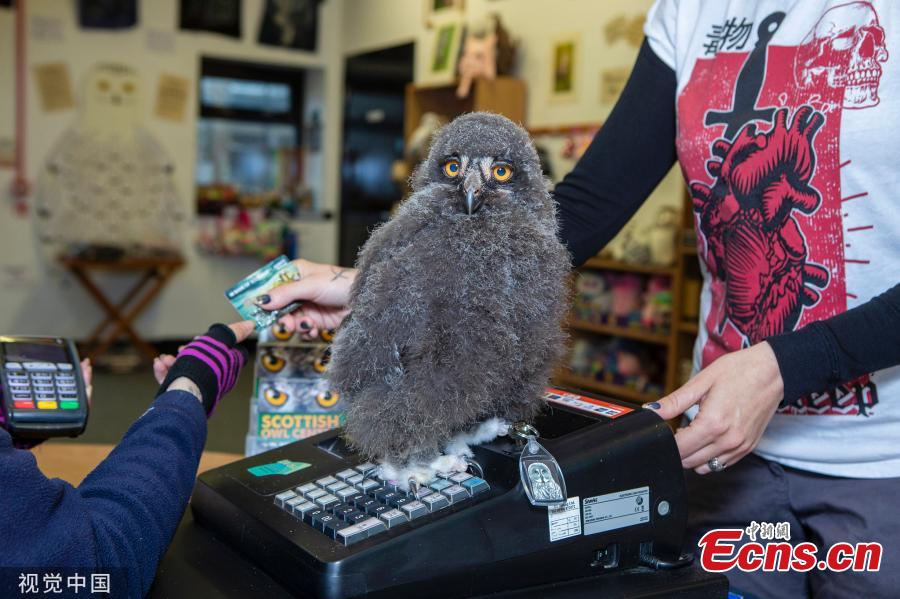 The fluffy dark grey bird with white claws and big orange and blue eyes currently lives at the Scottish Owl Centre in West Lothian. Born on May 27, the cute bird helps out senior keeper Tristan Williams, greeting people as they enter and even keeping guard of the cash register.(Photo/VCG)