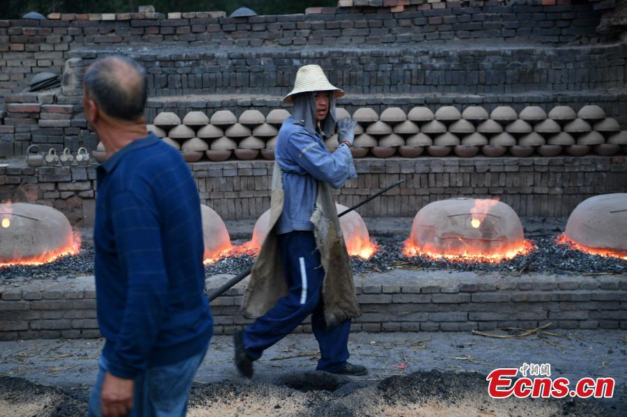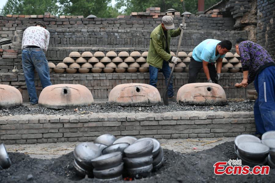 People make Qingshaqi, or green clay utensils, using traditional methods at a workshop in Baihedong Village of Yuxian County, North China’s Hebei Province, June 27, 2019. Qingshaqi are traditional handicraft products with more than 300 years' history. The utensils are made of Gantu, a kind of local soil, and have been used for cooking and boiling. The making of Qingshaqi has become a provincial intangible cultural heritage. The ancient craft is on the edge of disappearing due to limited market demand. (Xinhua/Yang Shiyao)