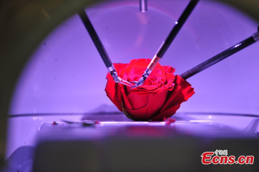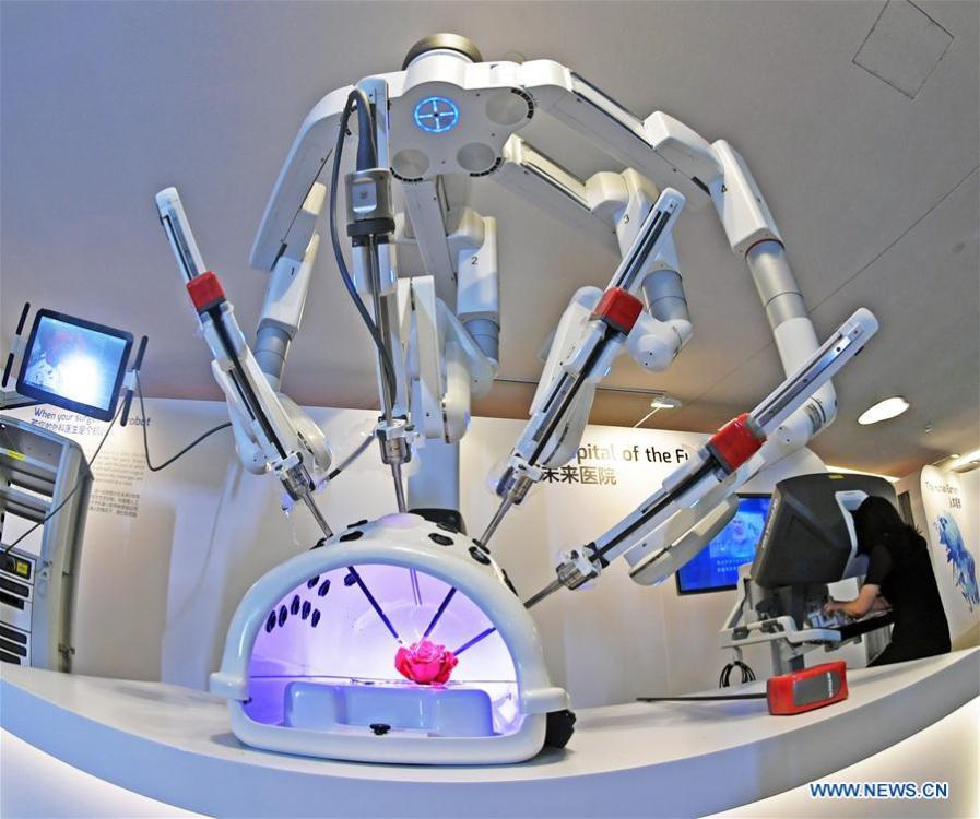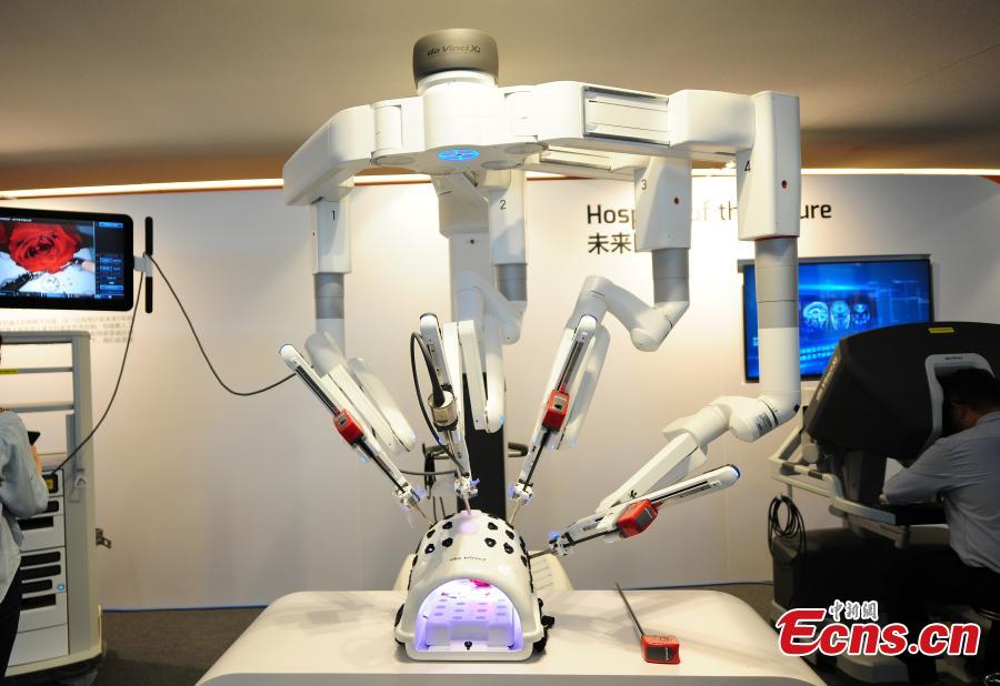 A robot surgeon gives a demonstration at an exhibition space of the 2019 Summer Davos in Dalian, northeast China's Liaoning Province, July 1, 2019. The 2019 Summer Davos forum will be held from July 1-3 in northeast China's coastal city of Dalian, with globalization in the spotlight. Also known as the 13th Annual Meeting of the New Champions, this year's forum will feature the theme "Leadership 4.0: Succeeding in a New Era of Globalization." (Photo/China News Service)