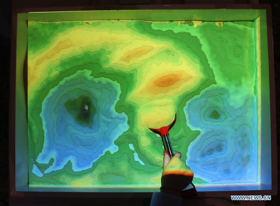 A staff member demonstrates a 5G mixed reality smart sandbox at an exhibition space of the 2019 Summer Davos in Dalian, northeast China's Liaoning Province, July 1, 2019. The 2019 Summer Davos forum will be held from July 1-3 in northeast China's coastal city of Dalian, with globalization in the spotlight. Also known as the 13th Annual Meeting of the New Champions, this year's forum will feature the theme "Leadership 4.0: Succeeding in a New Era of Globalization." (Xinhua/Yang Qing)