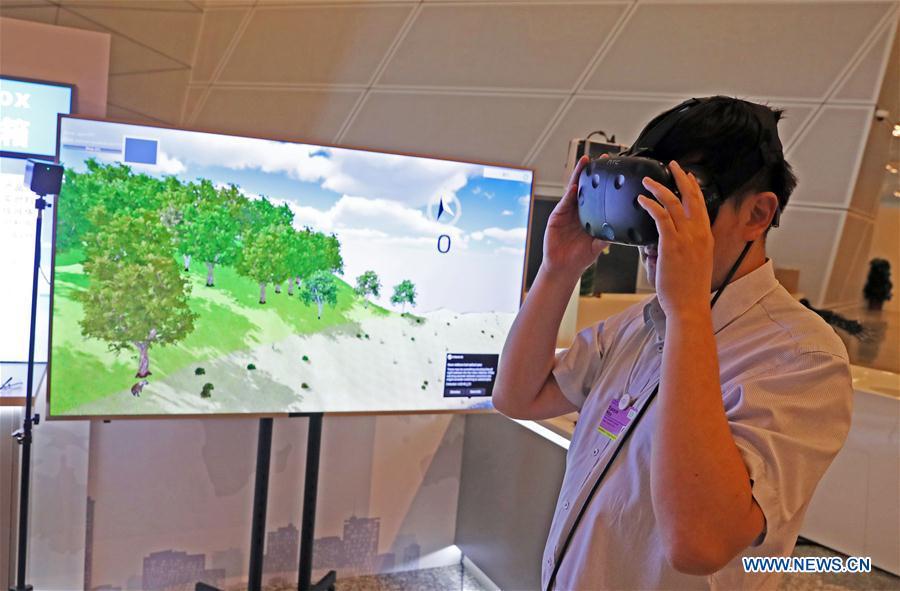 A delegate experiences a 5G mixed reality smart sandbox at an exhibition space of the 2019 Summer Davos in Dalian, northeast China's Liaoning Province, July 1, 2019. The 2019 Summer Davos forum will be held from July 1-3 in northeast China's coastal city of Dalian, with globalization in the spotlight. Also known as the 13th Annual Meeting of the New Champions, this year's forum will feature the theme "Leadership 4.0: Succeeding in a New Era of Globalization." (Xinhua/Yang Qing)