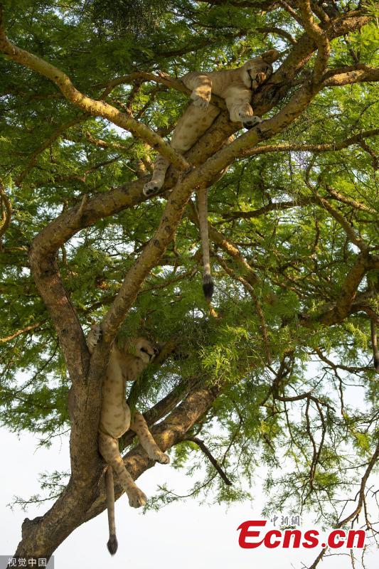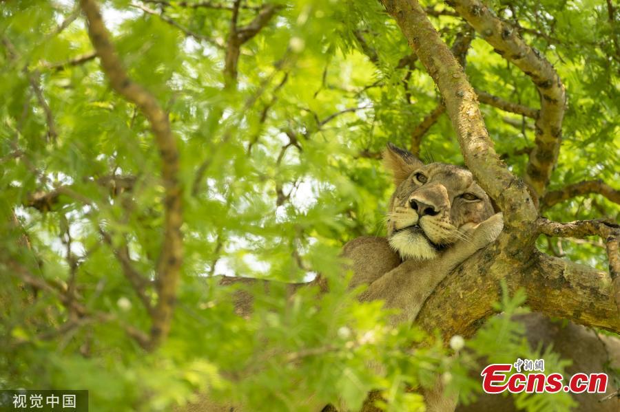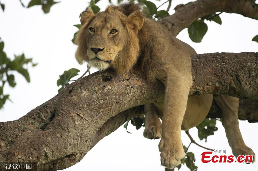 A photo taken by wildlife photographer Vince Burton inside the Queen Elizabeth National Park in Uganda shows a lion resting in a tree. Only two lions have been documented scaling trees to relax on their branches. (Photo/VCG)