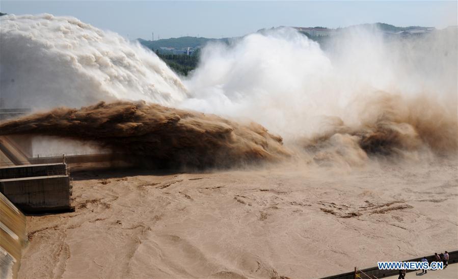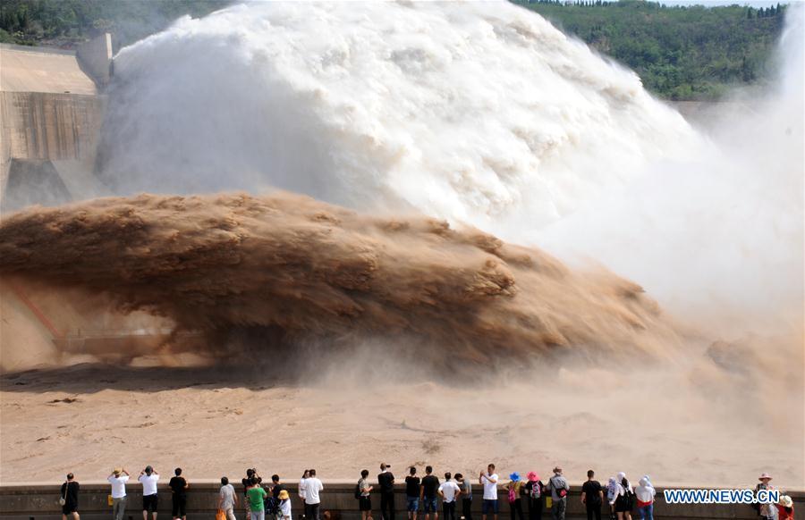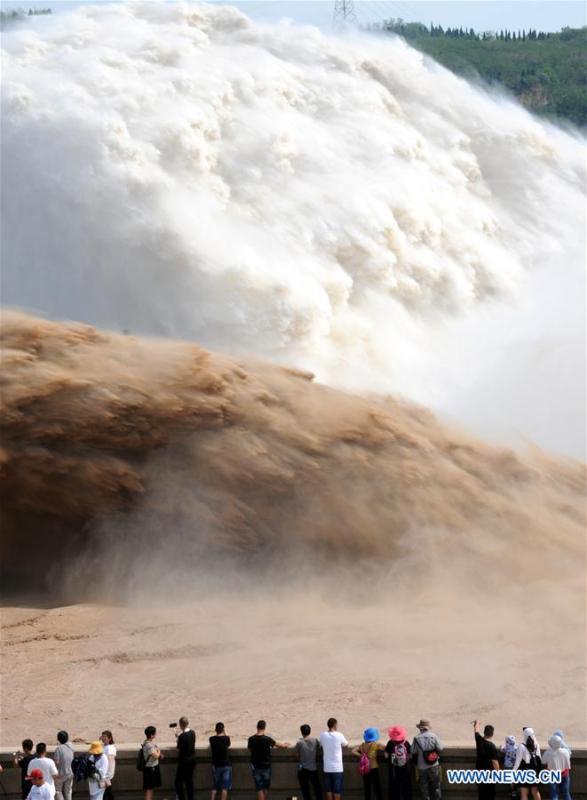 Tourists watch water gushing out from the Xiaolangdi Reservoir on the Yellow River in central China's Henan Province, July 2, 2019. (Xinhua/Miao Qiunao)
