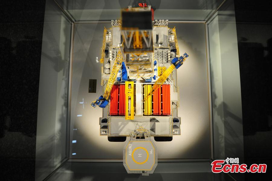 A model of the drilling rig HYSY 982 is on display alongside events for the 2019 Summer Davos in Dalian City, Northeast China's Liaoning Province, July 2, 2019. Made by Dalian Shipbuilding Industry, HYSY 982 is a sixth-generation deep-water semi-submersible drilling rig equipped with top technologies, designed for a maximum operating depth of 1,500 meters. (Photo: China News Service/Yu Haiyang)