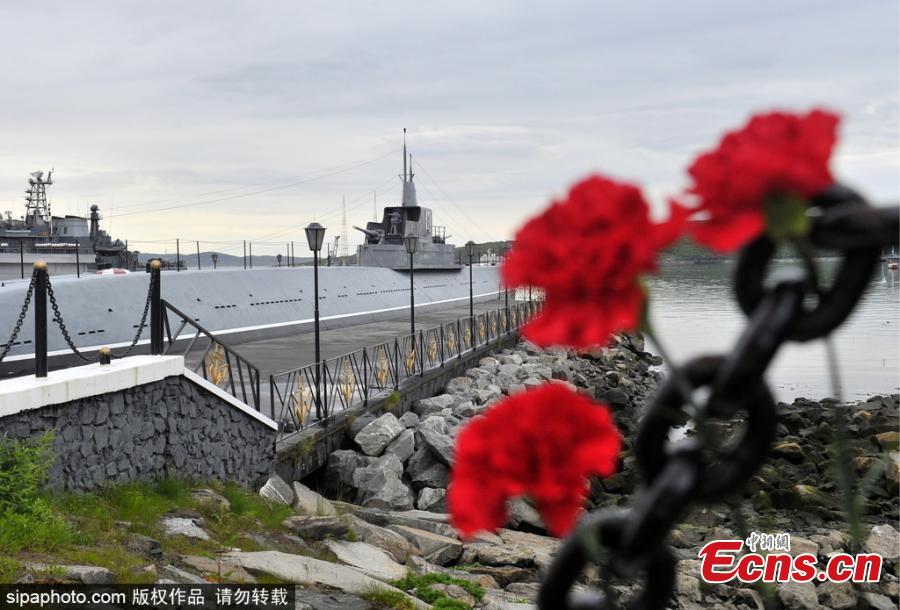 Flowers left by mourners in the port of Severomorsk in memory of 14 Russian Navy officers who died in a fire on a submersible in Russian waters on July 1, 2019. (Photo/Sipaphoto)