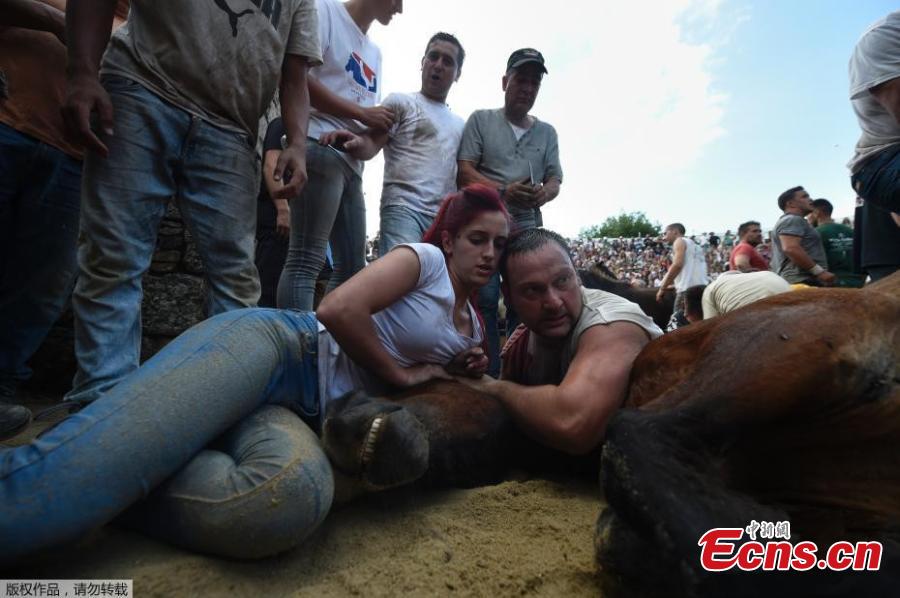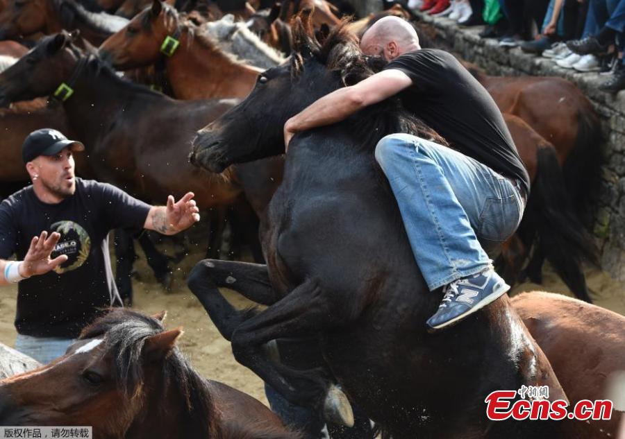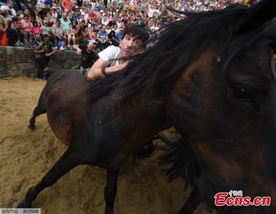 Spectacular images show Spanish villagers wrestling with and grabbing the wild animals during Rapa Das Bestas. The traditional three-day festival, which means 'Shearing of the Beasts' - has been held in Spain for some 400 years. Horses are brought down from the mountains and kept in a pen before men try to mark them and trim their manes. (Photo/Agencies)