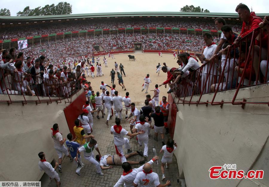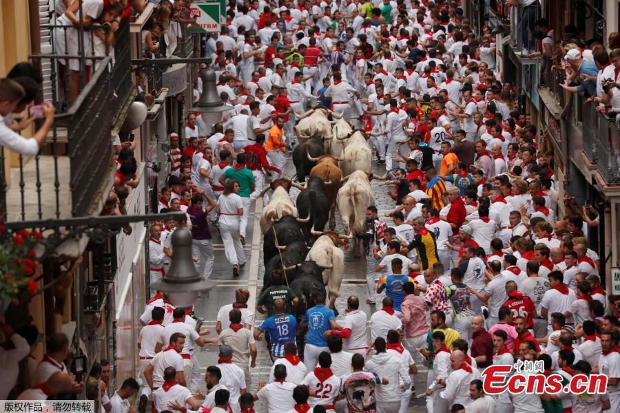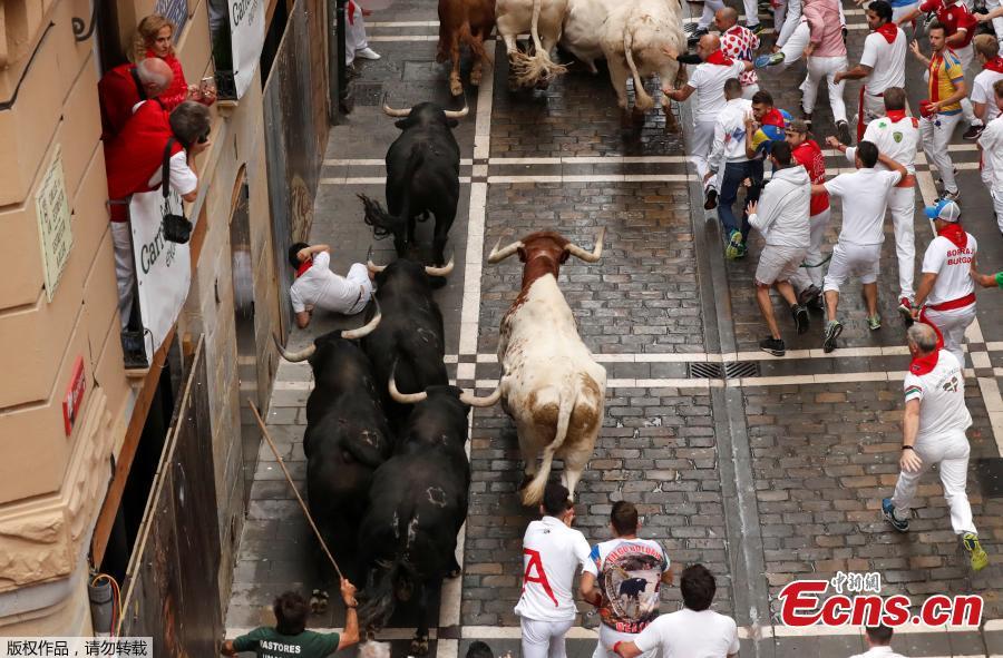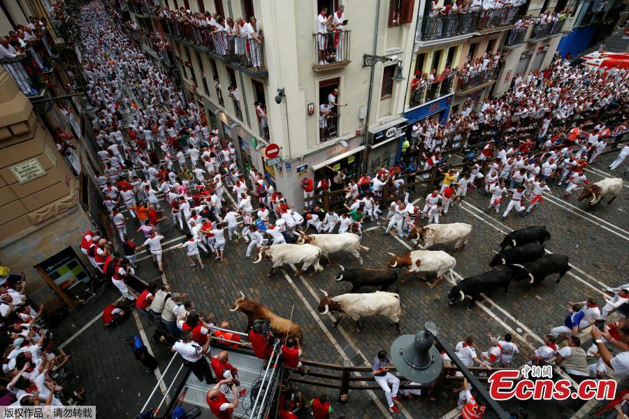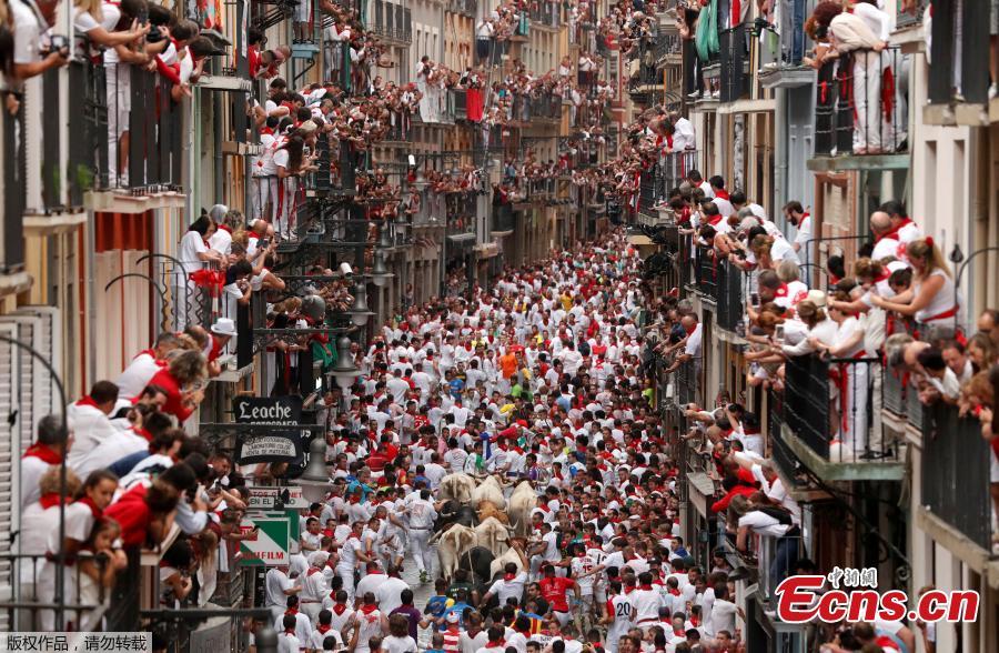 Revellers sprint in front of bulls and steers during the first running of the bulls at the San Fermin festival in Pamplona, Spain, July 7, 2019. (Photo/Agencies)