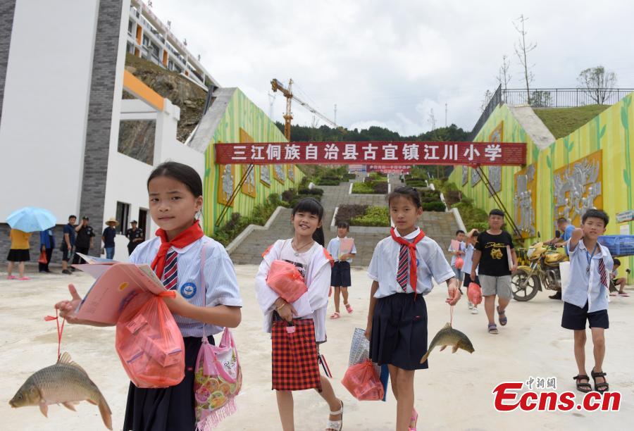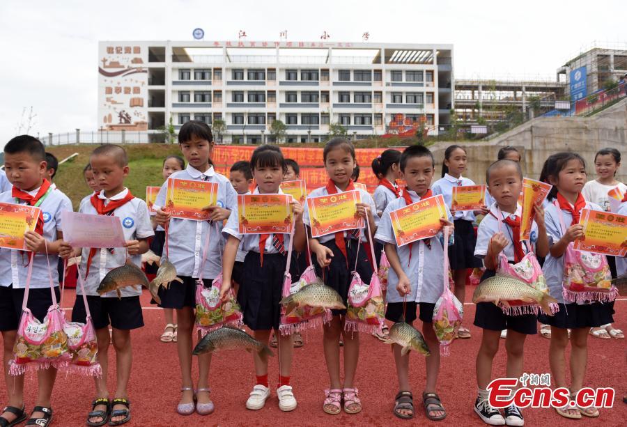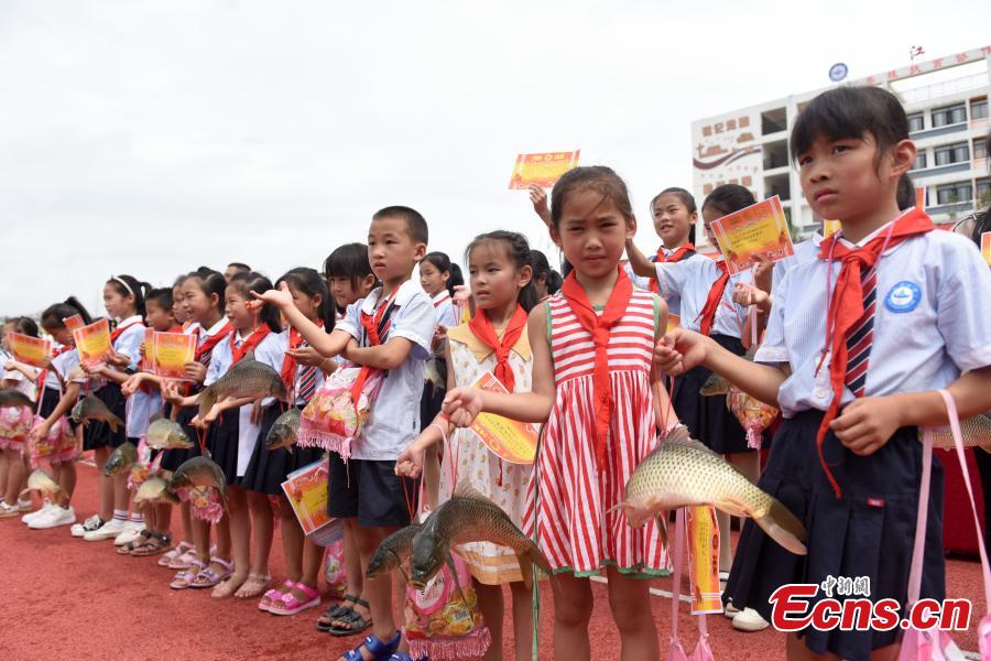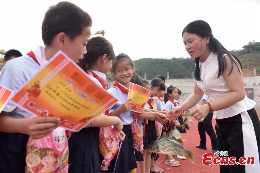 A teacher gives a student a carp in Guangxi on July 5, 2019. A primary school rewarded 140 students who passed their final examinations not only with merit certificates, but also carp weighing over 1 kilogram and a bag of jelly each in Sanjiang Dong Autonomous County of Guangxi. (Photo: China News Service/ Gong Pukang)