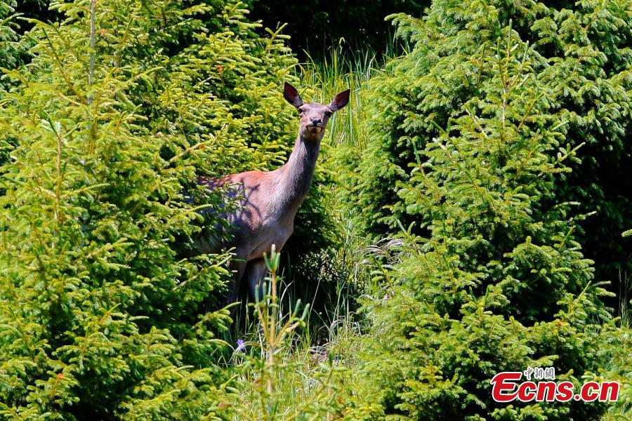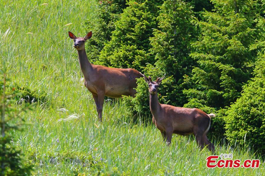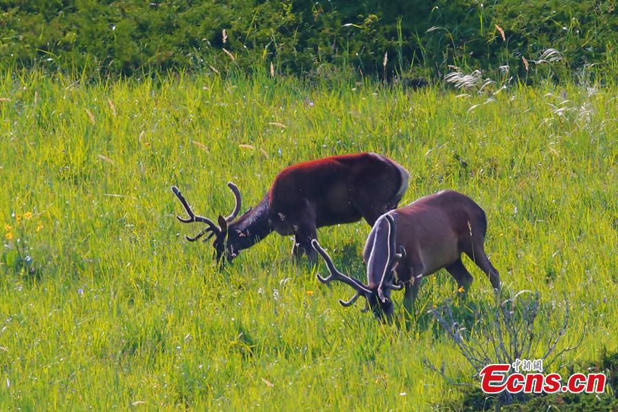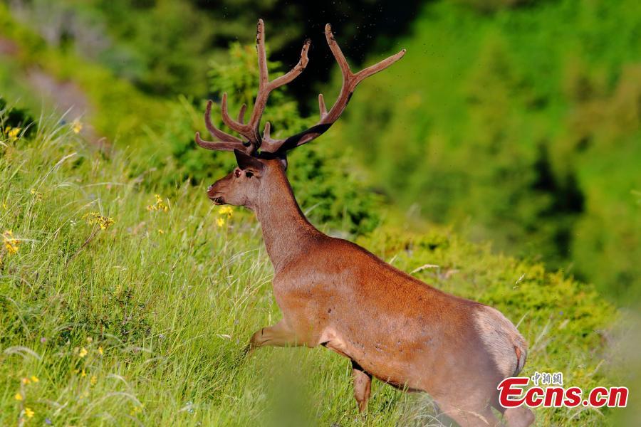The Tianshan wapiti or Tianshan maral are seen at Ba'erluke Mountain, Northwest China’s Xinjiang Uygur Autonomous Region. The species native to Tianshan Mountains is under second class animal protection in China. (Photo: China News Service/Chang Dianxue)