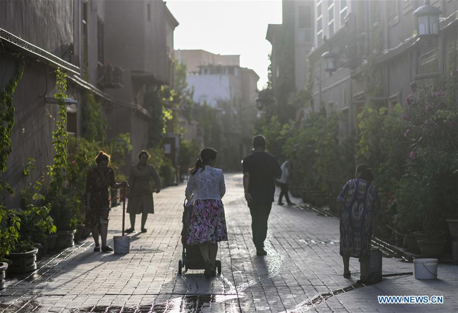 People stroll on the street in the morning at the ancient city of Kashgar, northwest China's Xinjiang Uygur Autonomous Region, July 9, 2019. In the first half of 2019, the ancient city of Kashgar received over 310,000 visits. (Xinhua/Zhao Ge)