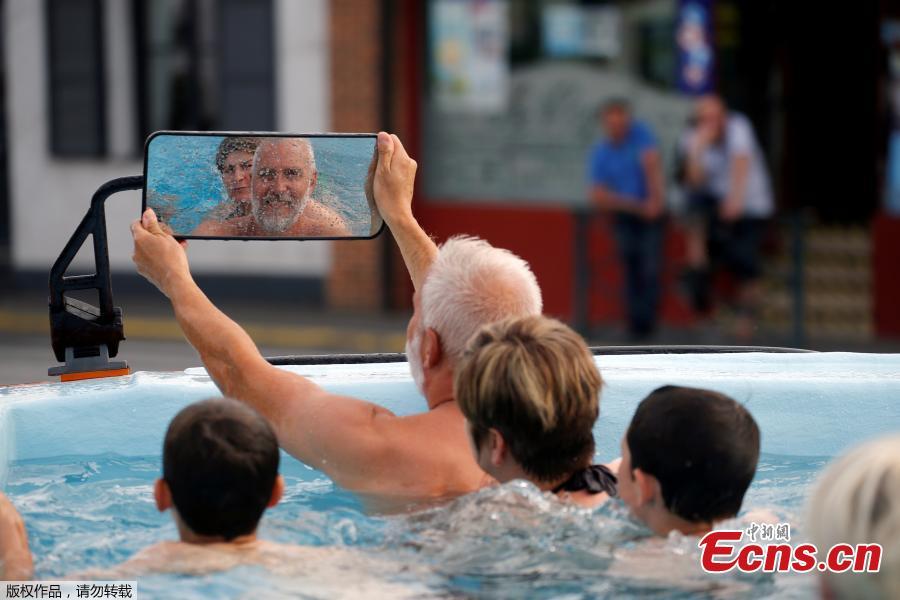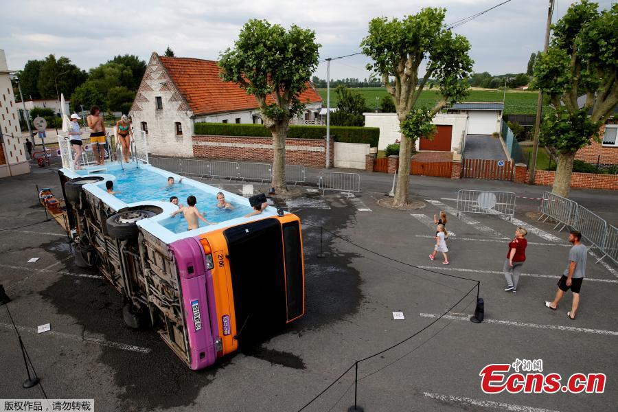 People bathe in a decommissioned city bus named "le bus piscine", an artwork by the French artist Benedetto Bufalino in Gosnay near Bethune, France, July 10, 2019. (Photo/Agencies)