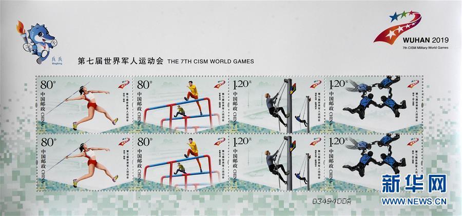 Photo shows the commemorative stamps for the seventh CISM Military World Games released by China Post, July 10, 2019. The military games will be held in Wuhan on October 18 - 27. The games, which began in 1995, are a multi-sport event for military sportspeople that is organized by the International Military Sports Council. Held every four years and lasting for 7 to 10 days, more than 100 countries participate in the games. (Photo/Xinhua)