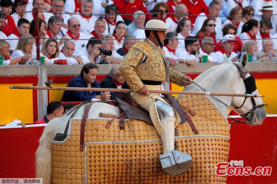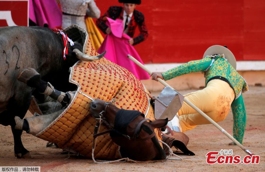 A horse of a Spanish picador is tackled by a bull during a bullfight at the San Fermin festival in Pamplona, Spain, July 9, 2019. (Photo/Agencies)