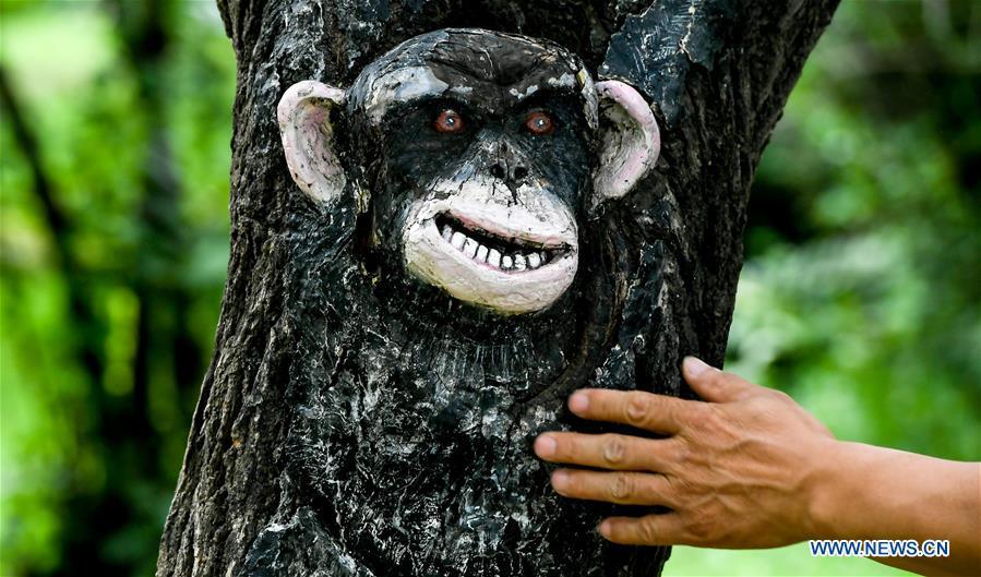 Photo taken on July 11, 2019 shows tree bark carving work titled The Macaque in Zoological and Botanical Garden of Changchun in Changchun, capital of northeast China's Jilin Province. More than 40 carving works made with tree barks and paintings created by Feng Shuxuan, an art designer working in the garden, are applied on the trees to cover the scars. (Xinhua/Wang Haofei)