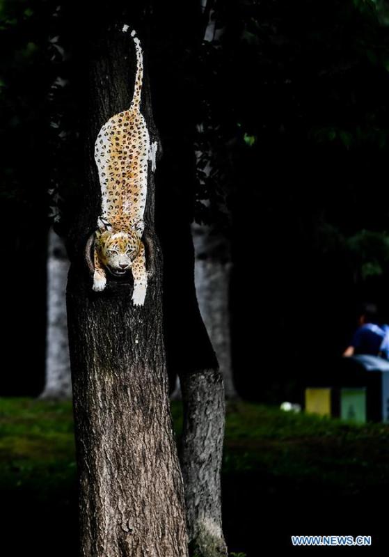 Photo taken on July 11, 2019 shows tree bark carving titled The Leopard in Zoological and Botanical Garden of Changchun in Changchun, capital of northeast China's Jilin Province. More than 40 carving works made with tree barks and paintings created by Feng Shuxuan, an art designer working in the garden, are applied on the trees to cover the scars. (Xinhua/Wang Haofei)