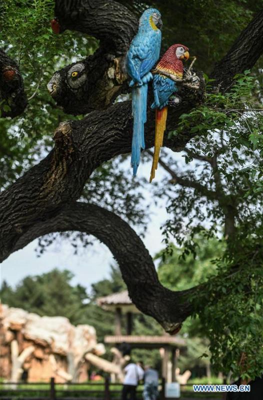 Photo taken on July 11, 2019 shows tree bark carving works titled The Owl and The Parrots in Zoological and Botanical Garden of Changchun in Changchun, capital of northeast China's Jilin Province. More than 40 carving works made with tree barks and paintings created by Feng Shuxuan, an art designer working in the garden, are applied on the trees to cover the scars. (Xinhua/Wang Haofei)