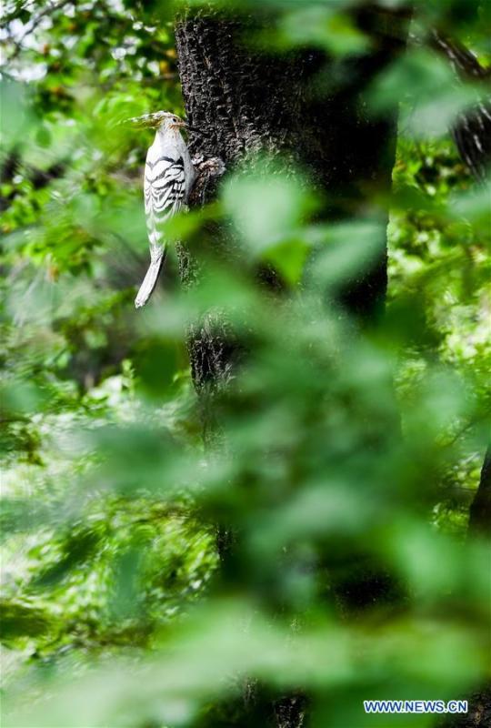 Photo taken on July 11, 2019 shows a tree bark carving work titled The Woodpecker installed in Zoological and Botanical Garden of Changchun in Changchun, capital of northeast China's Jilin Province. More than 40 carving works made with tree barks and paintings created by Feng Shuxuan, an art designer working in the garden, are applied on the trees to cover the scars. (Xinhua/Wang Haofei)