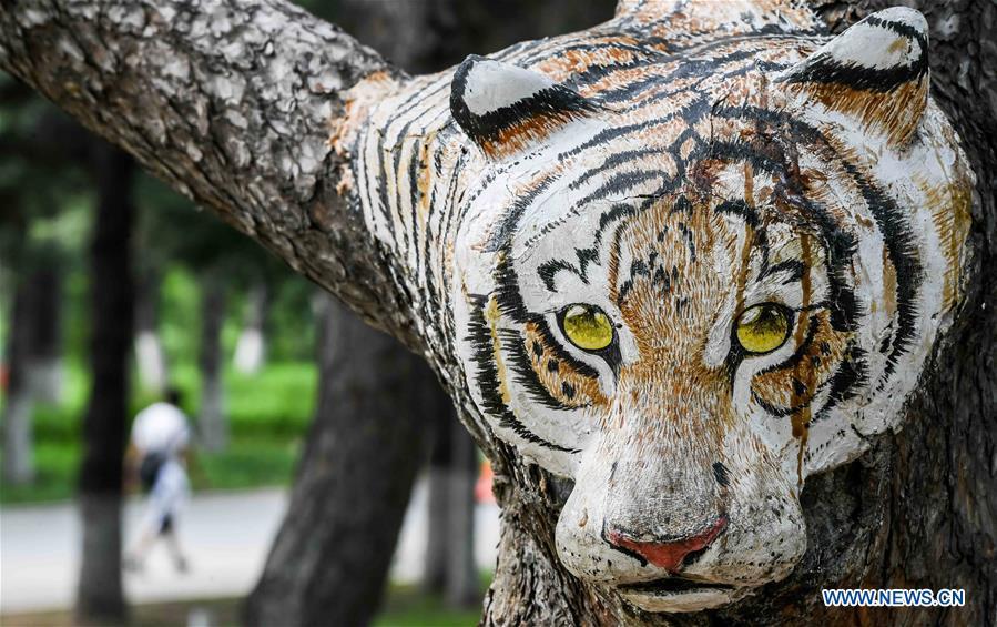 Photo taken on July 11, 2019 shows tree bark painting work titled The Manchurian Tiger in Zoological and Botanical Garden of Changchun in Changchun, capital of northeast China's Jilin Province. More than 40 carving works made with tree barks and paintings created by Feng Shuxuan, an art designer working in the garden, are applied on the trees to cover the scars. (Xinhua/Wang Haofei)