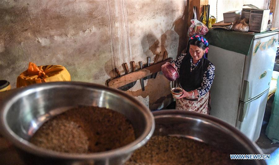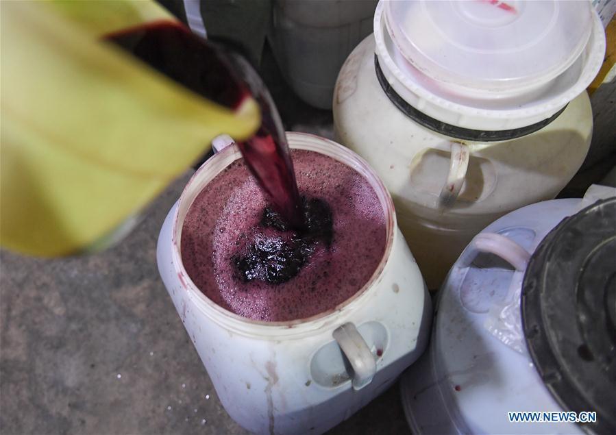 A resident makes wine at home in Naxi Township, Mangkam County, Chamdo, southwest China's Tibet Autonomous Region, June 3, 2019. Tibetans generally serve guests highland barley wine. In a township 1,000 km from Lhasa, capital of Tibet Autonomous Region, where some people of the ethnic Naxi group live, locals welcome guests with indigenous red wine instead. The township gets its name from the ethnicity of the inhabitants -- the ethnic Naxi people, though most of whom live in Yunnan Province, Tibet's neighbor. Under the jurisdiction of Mangkam County, Chamdo, Naxi Township is the only area for the Naxi minority in Tibet. It has an average altitude of 2,600 meters and a total population of 4,557. According to the annals of Mangkam County, a French missionary traveled to the township in the 19th century, bringing grape seeds and teaching locals to make wine. Grape plantation and wine-making have taken roots in the ethnic Naxi people since then. Red wine has therefore become a local specialty product there. Almost every family in the township knows how to make red wine through traditional natural fermentation methods. Apart from drinking red wine, local residents also sell them. Without fancy and expensive packaging boxes, red wine produced by Tibet's Naxi people has gained popularity and has been playing an important role in helping locals shake off poverty in recent years. (Xinhua/Jigme Dorje)